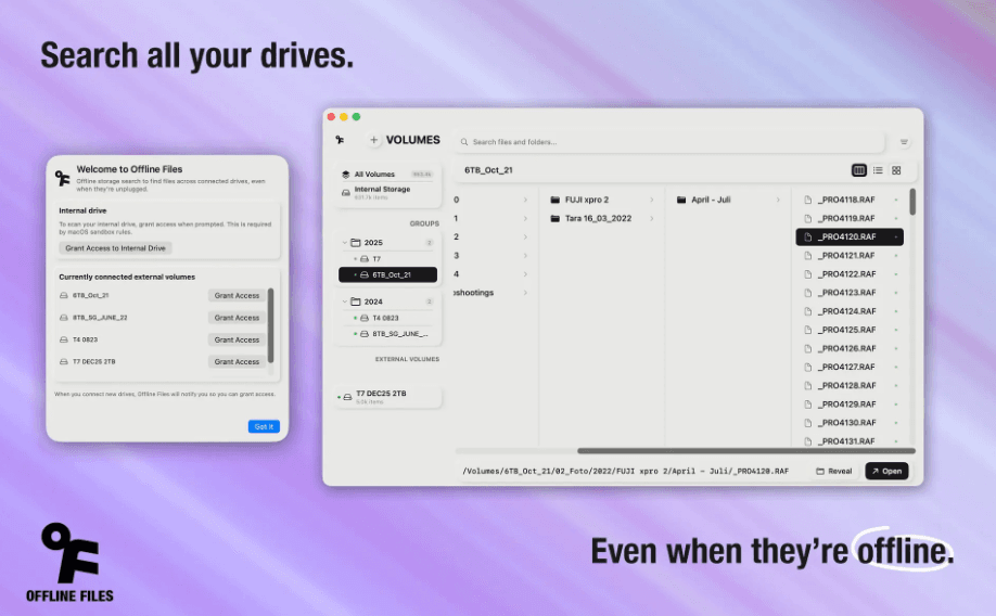Offline Files is a macOS app for anyone who works with multiple external drives. It indexes your volumes locally and makes every file searchable, even when the drive is disconnected.
